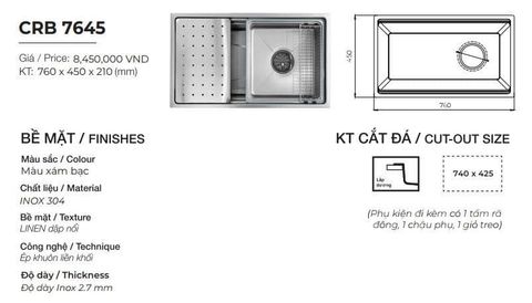 Chậu Rửa Bát Inox 304 CRB 7548 Xám Bạc – Đẳng Cấp Cho Không Gian Bếp Hiện Đại