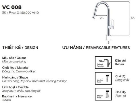Vòi chậu rửa bát VC 008 là lựa chọn hoàn hảo cho căn bếp hiện đại, mang lại trải nghiệm sử dụng tiện nghi và sang trọng. Thiết kế tinh tế với đầu vòi kéo ra linh hoạt, 2 chế độ nước thông minh và khả năng xoay 360° giúp việc nội trợ trở nên dễ dàng và sạch sẽ hơn bao giờ hết.