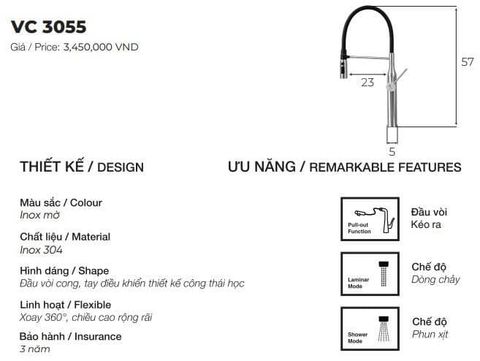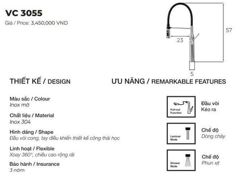 VÒI RỬA BÁT INOX 304 VC3055 – GIẢI PHÁP HIỆU QUẢ CHO GIAN BẾP HIỆN ĐẠI